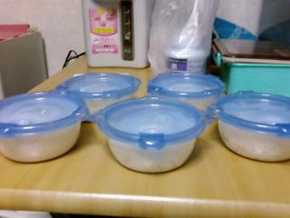 さて、写真に映っている物は何かというと、炊いたご飯を入れ、冷凍し、食べるときはそのままレンジでチンすればOKというものです。 この製品に出会う前までは、炊いたご飯(毎回3号炊く)を「サランラップ」に小分けし、冷凍庫に入れていたのですが、小分けする量が微妙に狂うと、食べるときにちょっと多かったり少なかったりで難儀したりしたものです。 でも、これさえあれば、もう分量が大きく狂うことはありません! 1個=茶碗1杯分なので、常に安定して米を食せるわけです^^; ワタクシはこれを「ニ●リ」で買いましたが、「東●ハンズ」など、調理器具を売っているところで入手できると思います。